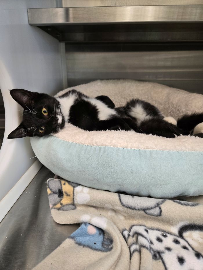 Al is a 5-month-old black and white tuxedo kitten with a heart as big as his curious green eyes. With his sleek coat and perfectly placed white whiskers, he looks like he’s always dressed for a fancy dinner party—but don’t let the formalwear fool you. Al is all about fun.