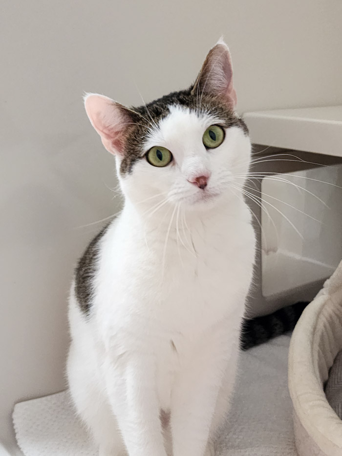 Antoinette adores cozy spots worthy of a queen’s throne. A soft blanket or sunny windowsill will do nicely. She welcomes gentle pets and head rubs. If you’re looking for a young adult cat, Antoinette is looking for a new family and home and she just might be the right feline for you.