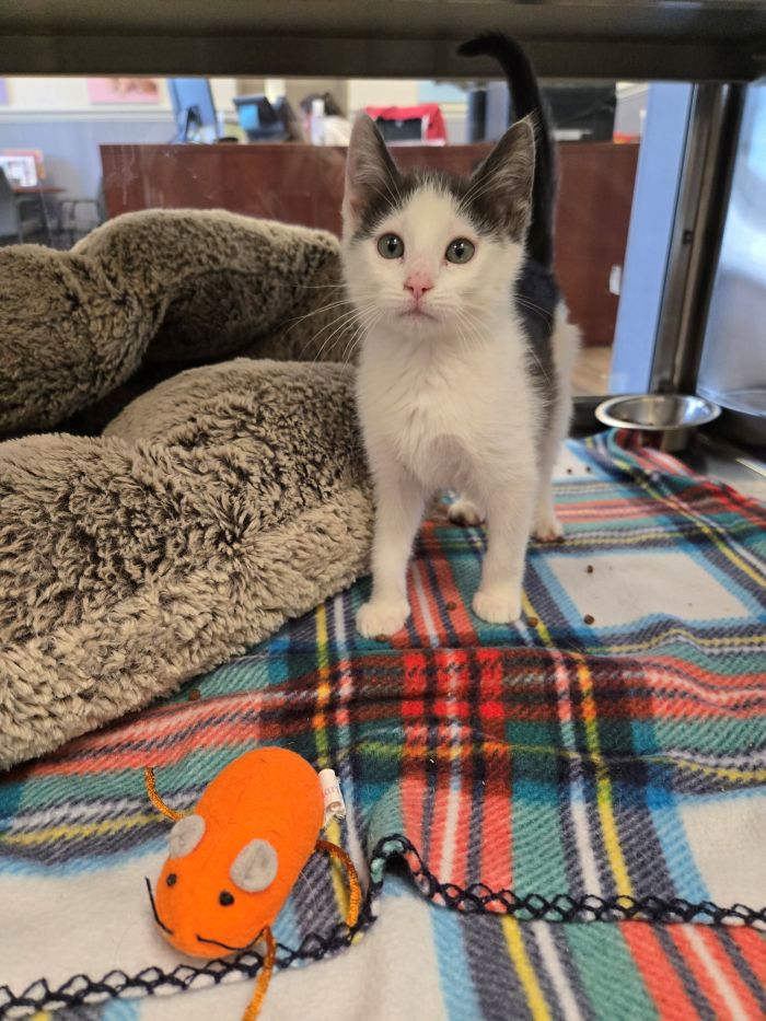 Banana is a 2.3‑month‑old female kitten with a soft grey‑and‑white coat and a personality that’s just as charming as her name. She’s the perfect mix of curious explorer and gentle cuddle buddy, always ready to investigate a new toy or curl up in your lap when she’s done adventuring