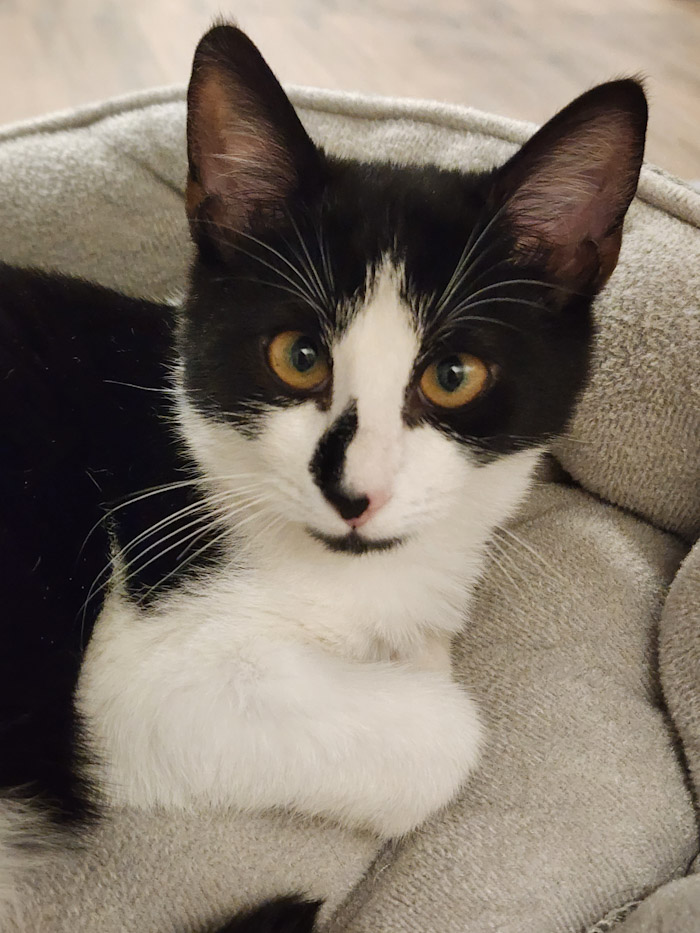 Bibble is a 4.7-month-old bundle of energy wrapped in a tuxedo coat. With his striking black and white fur, he looks like he’s always dressed for a fancy dinner—but don’t let the formalwear fool you. Bibble is all about fun, mischief, and snuggles.