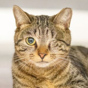 Phoenix is a 1.5‑year‑old male brown tabby with a heart as bold as his name. With his single bright eye and striking tabby stripes, he wears his past like a badge of honor and meets the world with curiosity, confidence, and charm.