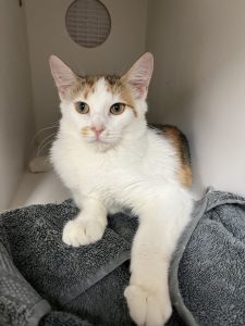 Antoinette adores cozy spots worthy of a queen’s throne. A soft blanket or sunny windowsill will do nicely. She welcomes gentle pets and head rubs. If you’re looking for a young adult cat, Antoinette is looking for a new family and home and she just might be the right feline for you.