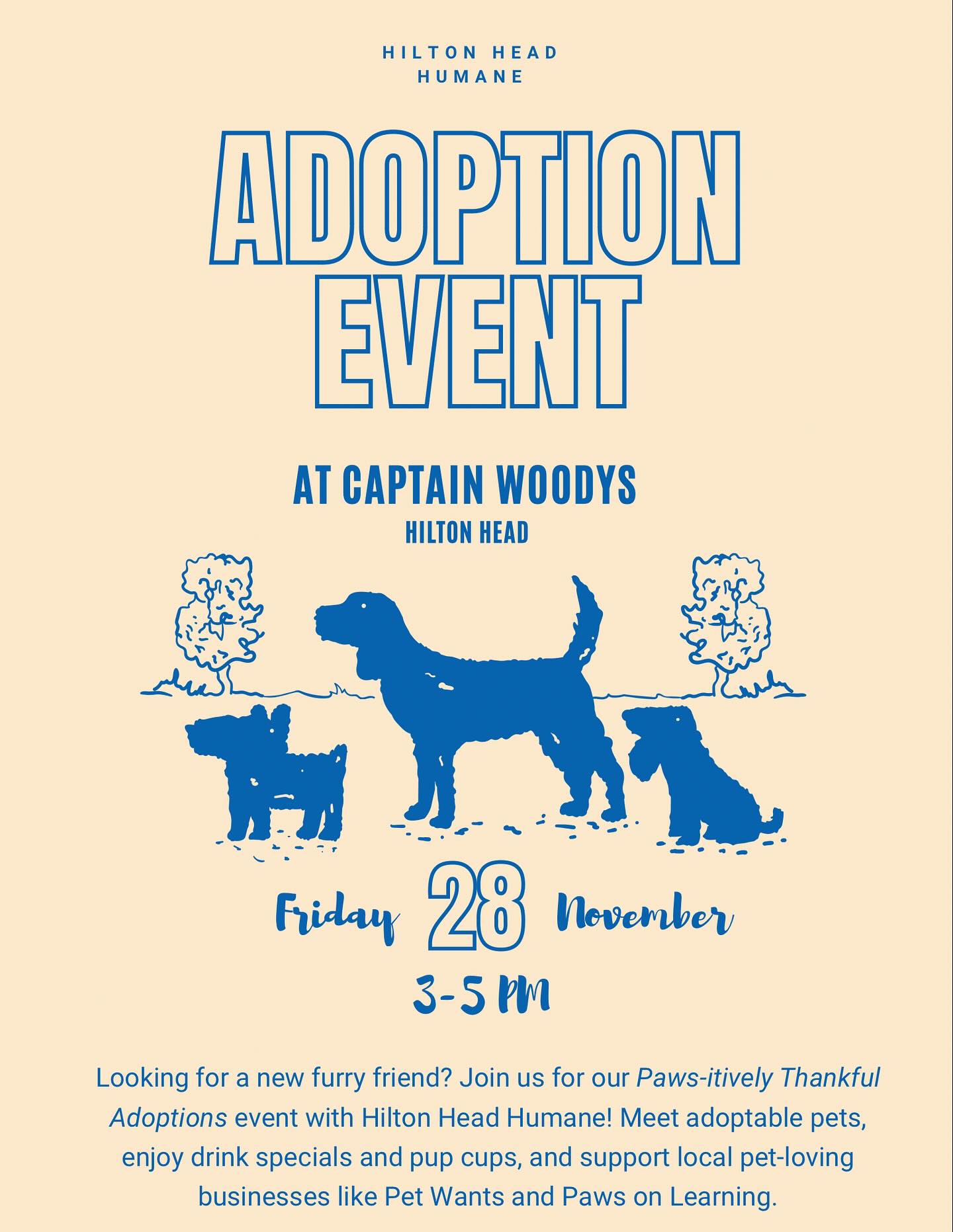 Paws-itively Thankful Adoption Event: Friday, November 28th from 3PM to 5PM, Captain Woody’s, HHI
