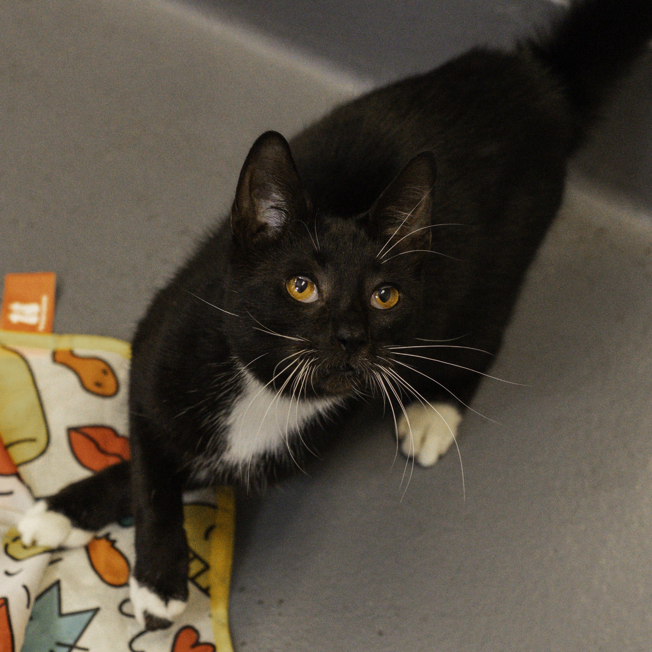Start your engines — Motorcycle is ready to zoom into your heart! This 1-year-old black and white male cat is a sleek, stylish bundle of energy with a name that suits his personality: