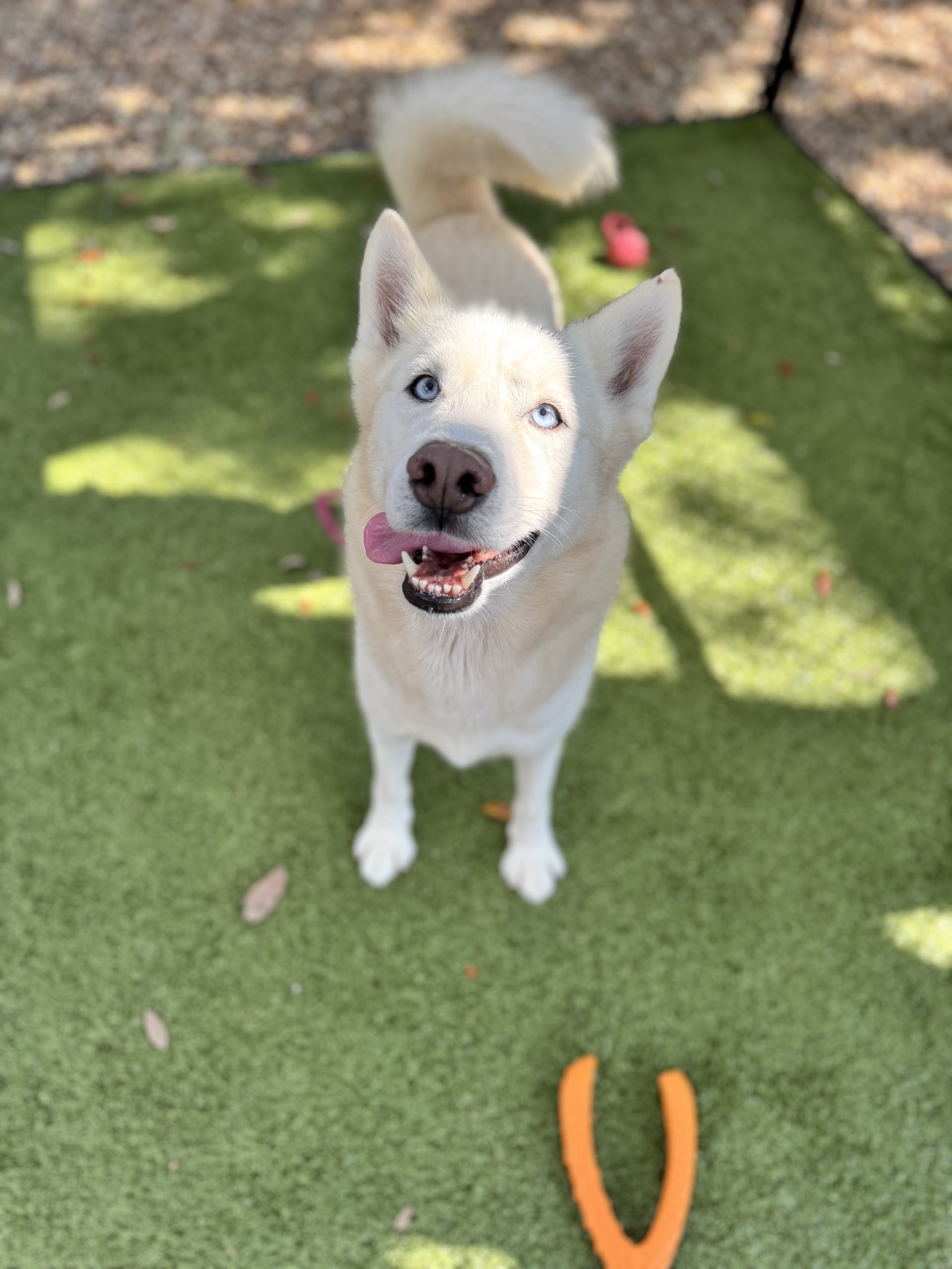 Nordic has that classic Husky personality- playful, curious, and a teensy bit dramatic. He loves roaming the yard, going for walks, and being right in the middle of whatever fun you’re having. This loving, moderately active guy is treat-motivated and would be thrilled to learn new tricks in exchange for snacks. He’s also a big fan of toys such as Nylabones, tennis balls, and anything that squeaks… especially when he can toss them in the air like the silly showman he is! If you’re looking for a dog who will make every day feel like an adventure, with a side of comedic relief, Nordic is ready to warm your heart no matter the season!