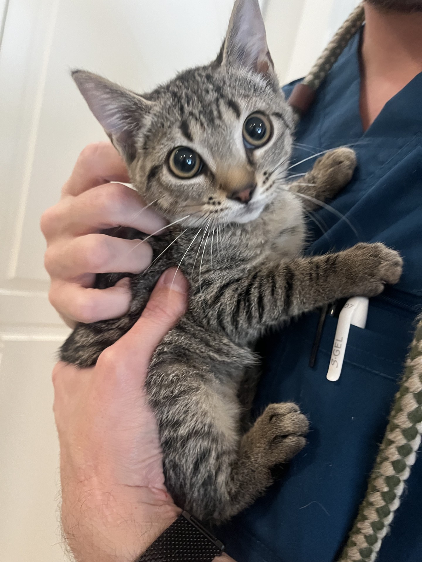 Taffeta is a 3-month-old brown tabby has the sweetest, most easygoing personality. Taffeta is calm, gentle, and always ready for a good snuggle. Whether she’s lounging in a sunny spot or curling up in your arms, she brings instant warmth and comfort wherever she goes.
