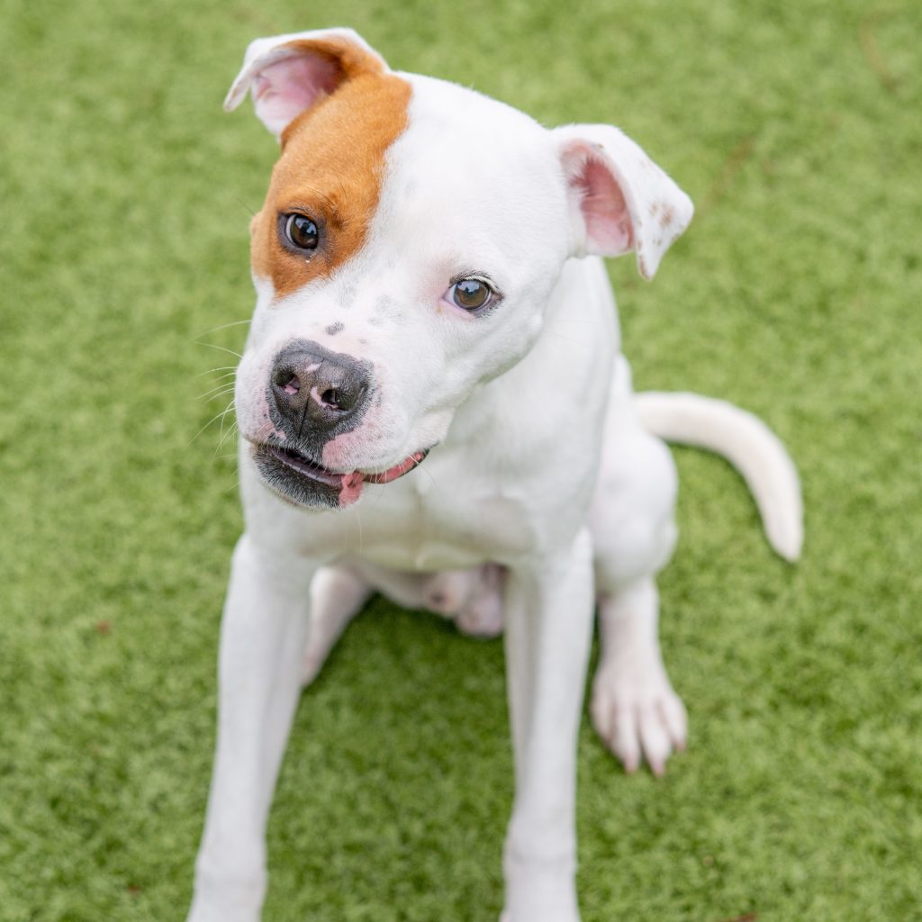 This handsome 3-year-old boxer mix weighs about 46 lbs and is the perfect mix of brains, playfulness, and heart. Yoder is a very smart boy who already knows how to sit and would thrive with continued training (especially if treats are involved- his favorite subject). He loves to play, gets along great with other dogs, and is always up for walks, romping around the yard, and new adventures. A beach day? Yes please. A pup cup stop? Even better!